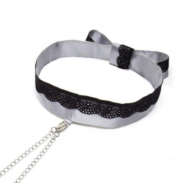 Роскошный ошейник выполнен из серого атласного материала и декорирован нежнейшим черным кружевом. Ошейник не имеет замка, его можно завязать на узел либо на бант. Металлическое D-образное кольцо позволяет крепить к ошейнику различные девайсы